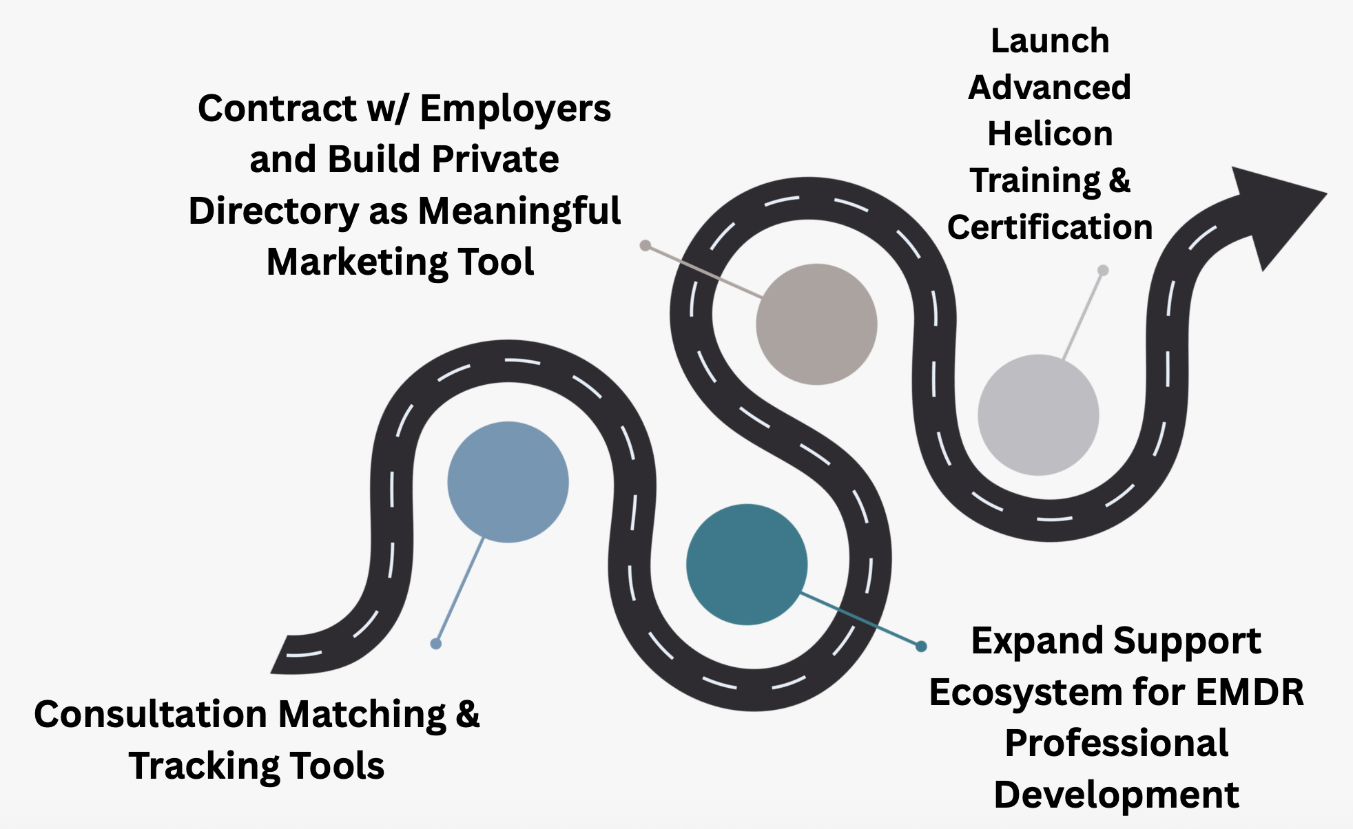 Supporting EMDR Therapists with consultation matching and tracking tools, with goals to build an ecosystem providing community; advanced consultation, training, and certification options; and marketing through an exclusive private directory (future goal).